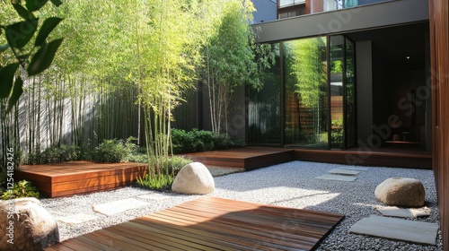 © Sampao, Fototapeta premium Bamboo garden with a serene atmosphere, wooden pathways, and stone accents.