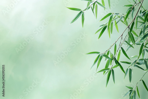 Fototapeta premium Bamboo leaves gently sway against soft green background, creating serene and calming atmosphere