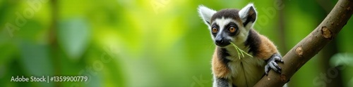 © chaikrit, Naklejka premium Bamboo lemur clings to branch, grass in mouth, colourful, tree