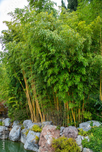 © Victor1153, Obraz premium Bamboo phyllostachis (Latin Bambusa) growing on the shore of a pond on a clear sunny day. Flora is the nature of a plant.