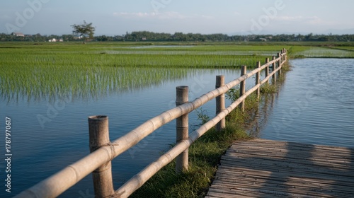 © Cozirlax, Naklejka premium Bamboo Poles Spanning Across a Flooded Field with Lush Green Rice Plants Under Clear Sky