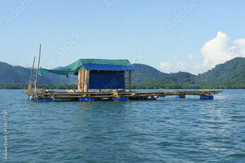 Fototapeta premium Bamboo raft floating on water with mountain background