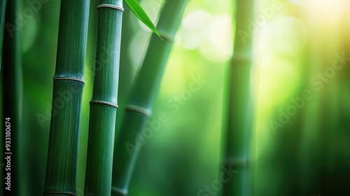 Fototapeta premium Bamboo stalks glow under soft sunlight, their green surface and texture...