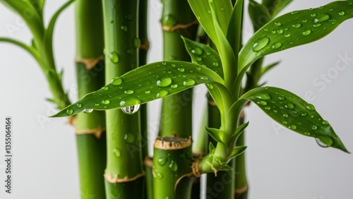 © Qbertstudio, Obraz premium Bamboo stalks & leaves with water droplets create minimalist still life. Close-up, indoors. Symbolizes freshness, tranquility, purity, wellness, zen and sustainable environment.