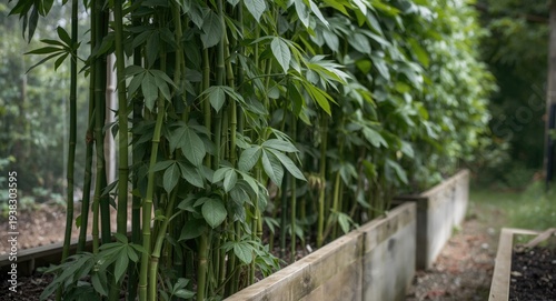 Obraz premium Bamboo supported organic runner beans growing in a raised vegetable patch