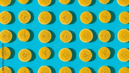 © Bierzicreator, Fototapeta premium Banana Slices on a vibrant blue background, creating a visually appealing and healthy food display.