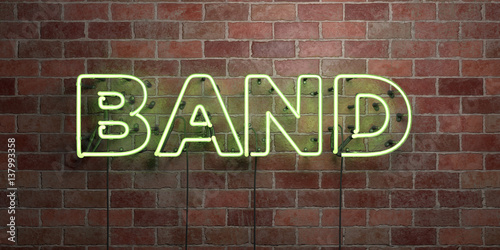 © Chris Titze Imaging, Obraz premium BAND - fluorescent Neon tube Sign on brickwork - Front view - 3D rendered royalty free stock picture. Can be used for online banner ads and direct mailers..