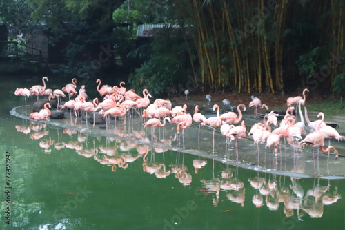 Naklejka premium Bandada de Flamencos en laguna de Zoológico