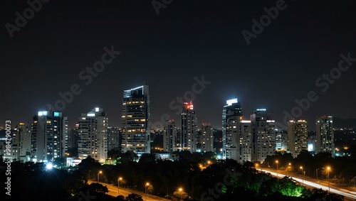 © Kasper, Fototapeta premium Bangalore city skyline at night—modern architecture of Silicon Valley.