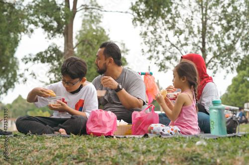 © ellinnur, Obraz premium Bangi, Malaysia - Oct 16, 2021 Family picnic and eating at the park.