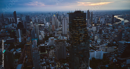Fototapeta premium Bangkok aerial view from the drone to downtown Sathorn area with conterporary...