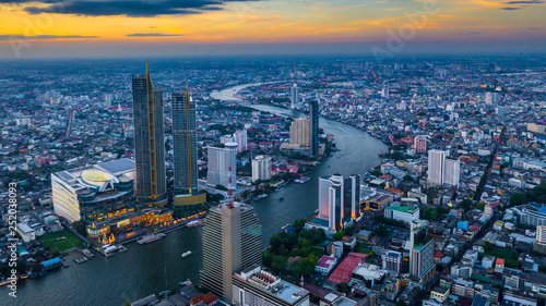 Fototapeta premium Bangkok City aerial view, Aerial view from above of skyscraper and chao phaya...