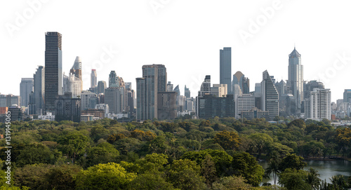 © ImageFlow, Obraz premium Bangkok city skyline with tall skyscrapers and a green park in the foreground, isolated on a white background. Urban architecture and nature contrast concept