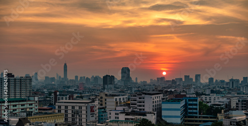 Obraz premium Bangkok city with a beautiful sunset over the skyline with orange skies,...