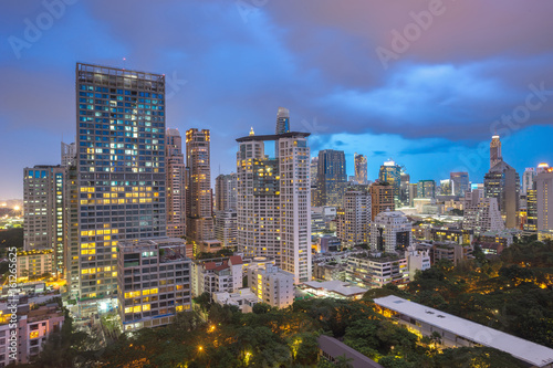 © Surapong, Obraz premium Bangkok cityscape at blue hour with the park. Many building view on skyscraper.