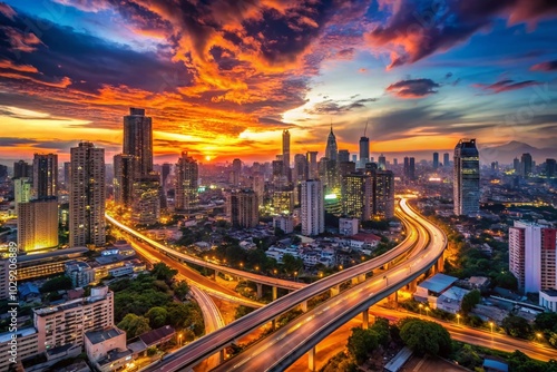 © prapatsorn, Fototapeta premium Bangkok Skyline at Sunset: Urban Highway Traffic and Cityscape Motion Photography