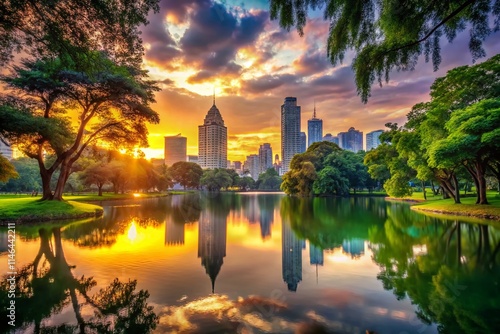 © prapatsorn, Fototapeta premium Bangkok Skyline Double Exposure: Lumphini Park & GPF Witthayu Towers