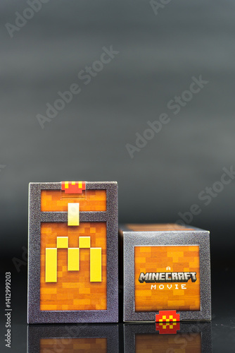 © Dontree, Fototapeta premium Bangkok, Thailand - April 16, 2025 : Blind box toy from McDonald's collaboration with Minecraft movie limited edition.
