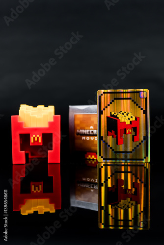 Fototapeta premium Bangkok, Thailand - April 10, 2025 : Fry Helmet Minecraft from McDonald, Toy form Minecraft blind box from McDonald's collaborates Minecraft the movice