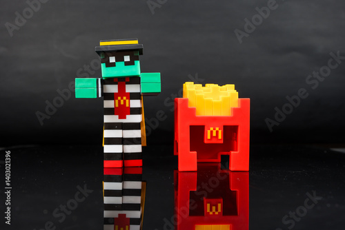 © Dontree, Fototapeta premium Bangkok, Thailand - April 6, 2025 : Zombie hamburglar and Minecraft fries helmet, Minecraft blind box from McDonald's collaborates.