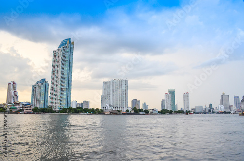 © Kallayanee, Fototapeta premium Bangkok, Thailand-August 30, 2015: Building and house near the Chao phraya river.