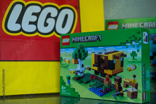 Fototapeta premium Bangkok, Thailand - January 19, 2024 : A box of LEGO Minecraft The Bee Cottage number of 21241. Action-packed set featuring Minecraft iconic bees. Lego is a popular line of construction