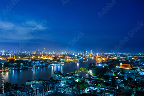 © Pongvit, Obraz premium BANGKOK THAILAND -09 Jun 2007: View of the Grand Palace and Wat Phra Kaew Temple With the Chao Phraya River in Bangkok, Thailand at night panoramic horizontal photo