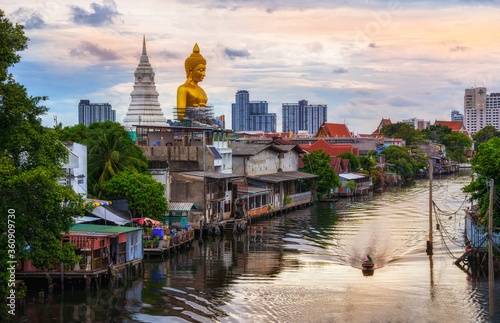 © somchairakin, Fototapeta premium BANGKOK, THAILAND - JUNE 16, 2020 : The big golden buddha statue under construction seen from a distance at Khlong Bangkok Yai, Bangkok, Thailand.