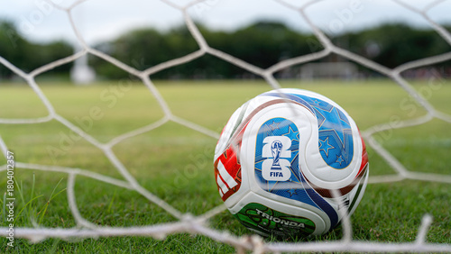 © Nattawit, Naklejka premium Bangkok, Thailand - 18 November 2025: Adidas "Trionda" the official match ball for Fifa World Cup 2026 that co-host in America. The ball is placed on grass pitch with football stadium component.