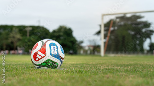 © Nattawit, Naklejka premium Bangkok, Thailand - 18 November 2025: Adidas "Trionda" the official match ball for Fifa World Cup 2026 that co-host in America. The ball is placed on grass pitch with football stadium component.