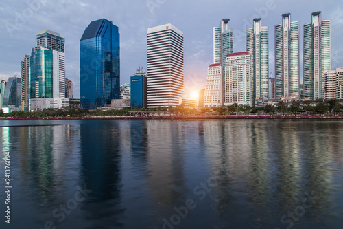 Naklejka premium Bangkok twilight, Business building with light and reflection, view from Benjakitti park in Bangkok, Thailand