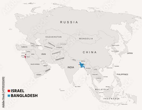 © habib billah, Fototapeta premium Bangladesh and Israel Highlighted on Asia Map Showing Borders and Geographic Locations