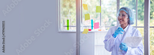 Fototapeta premium Banner Asian woman scientist hand write note research in medical lab look at...