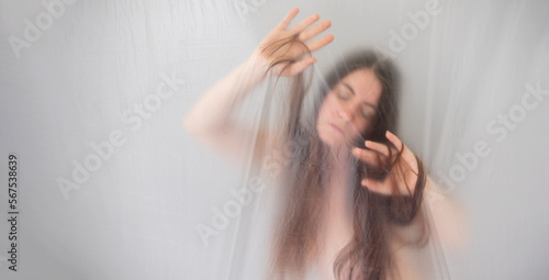 Fototapeta premium banner blurred, fuzzy image of sensual romantic young naked woman portrait behind plastic film, looking down, playing shy with her hair, moves in ecstasy