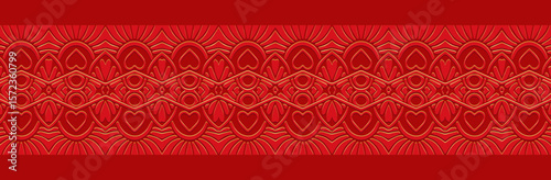 © swetazwet, Fototapeta premium Banner, cover design, wallpaper, fresco. Geometric ethnic pattern with handmade hearts on a red background, embossing, 3D. Ornaments, arabesques, mandala, painting of the East, Asia, India, Mexico.