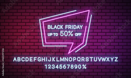 Fototapeta premium Banner for black Friday sale. Neon sign and alphabet on brick wall. Vector illustration.