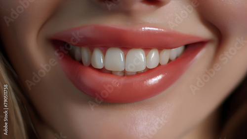 © Elena, Fototapeta premium banner for dentistry, beautiful smile with straight white teeth of a young girl close-up. Design for dentistry industry.