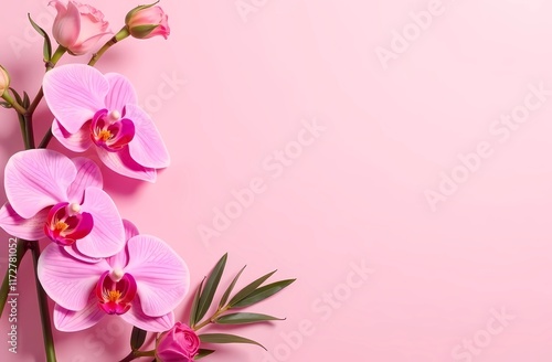 © Ana River, Naklejka premium Banner for International Women's Day. March 8 with floral design. Pink orchids, roses and fox palms. Stylish postcard