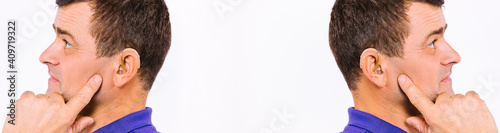 Obraz premium Banner, long format. Mirror image of a caucasian man with a hearing aid on a white background.
