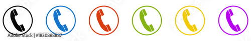 Obraz premium Banner mit 6 farbigen Icons im Kreis: Kontakt, Hotline oder Telefon