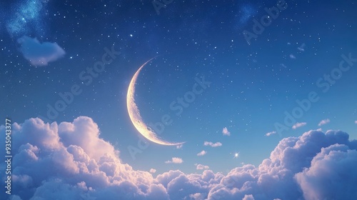 © MUdaylah, Fototapeta premium Banner Of Bright Glowing Crescent Moon Above Fluffy Clouds With Starry Sky Background with generative ai