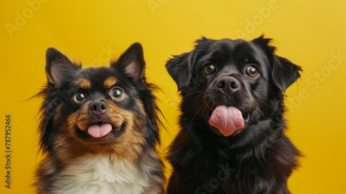 © Plaifah, Obraz premium Banner pets eating. Portrait summer spring hungry cat and dog licking its lips with tongue. Isolated on yellow backgorund