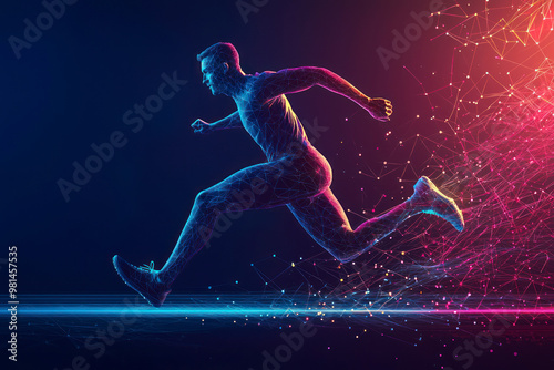 © Hunman, Naklejka premium Banner. Sportsman, jogger running in motion against gradient dark background with polygonal and fluid elements. Speed.