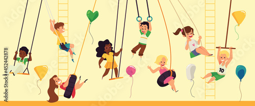 © sabelskaya, Obraz premium Banner with children on playground rocking on swings, flat vector illustration.