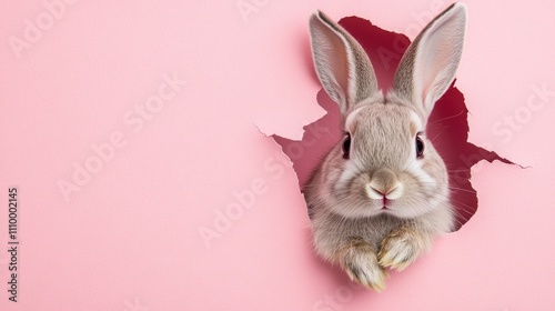© PI, Obraz premium Banner with copy space and a charming rabbit's head looking through a torn pink surface