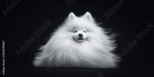 Fototapeta premium Banner with fluffy white dog posing serene calm dark background showcasing perfect fur calm peaceful scene