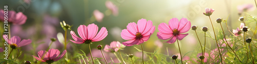 Fototapeta premium banner with pink garden cosmos flowers on a summer meadow with warm light