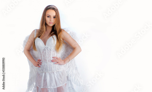 © Volodymyr, Naklejka premium Banner with sexy angel woman. Festive Art Greeting Card. Cupid girl aiming at someone with an arrow of love. Angel in love. Angelic face. Pretty girl as the cupid with a wings