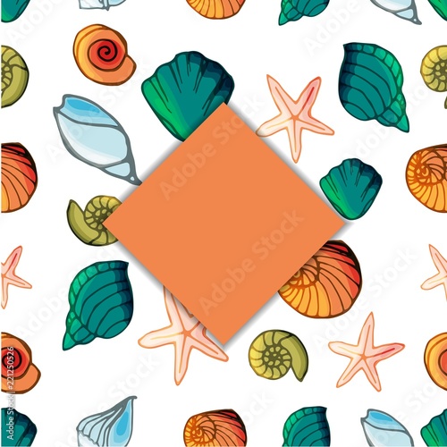 © Lytvynenko Anna, Naklejka premium Banner with shells in cartoon style