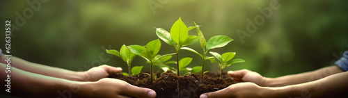 © Odin, Naklejka premium Banner with small growing tree in hands. Nature background, Ecology concept. Generative AI